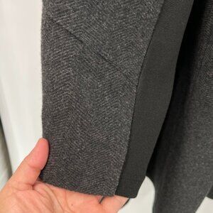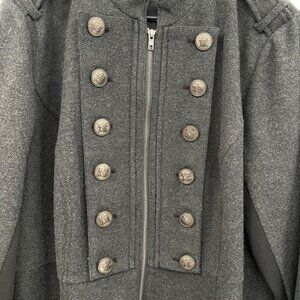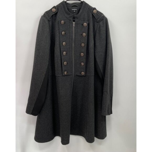 Torrid double-breasted military-inspired coat in dark gray. This coat features striking ornate buttons down the front and on the epaulets, a flattering fit and flare silhouette, and contrast paneling on the sleeves and sides. Its structured design makes it perfect for adding a touch of drama to your everyday look or for dressing up for a night out.