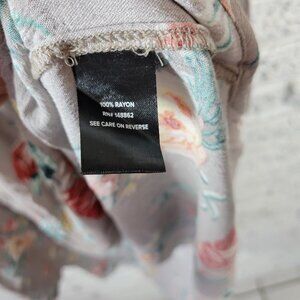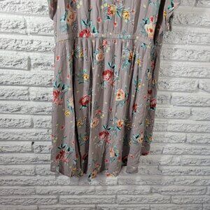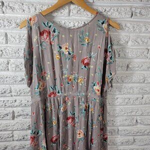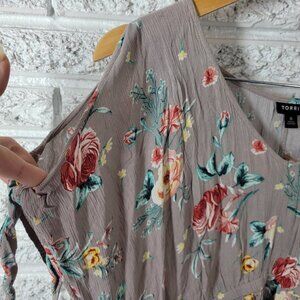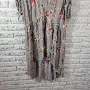 This Torrid dress features a beautiful floral pattern and a V-neckline with a pullover closure. The short cold shoulder sleeves add a touch of elegance to the dress, making it perfect for both casual and travel occasions. The dress is made of lightweight rayon fabric and is dry clean only. It comes in a gray color and has a hi-low dress length. The dress is perfect for plus-sized women, with a size type of Torrid 0X. The dress is suitable for all seasons, including winter, summer, fall, and spring.