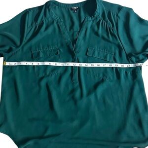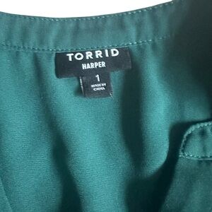 This is the Harper work top from Torrid in teal-green (this appears more green than blue) size 1/XL. 3/4 Sleeve with front button detail and two functional pockets.