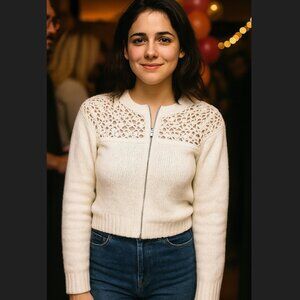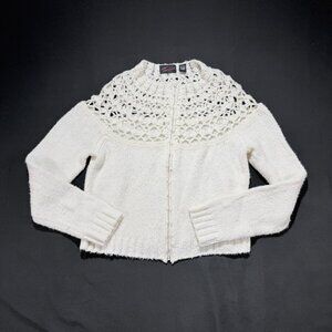 The Torrid Women's Knit/Crochet Sweater in size 2 is a stylish and cozy addition to any woman's wardrobe. This white cropped sweater features a solid pattern with a crew neck and long sleeves, making it a versatile piece for both casual and formal occasions. Made from a blend of wool and acrylic, this sweater has a knit fabric type and crochet accents that add a unique touch. The full zip style and regular size make it easy to wear and comfortable for all-day wear.