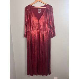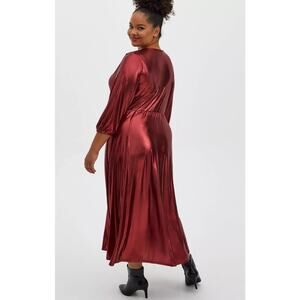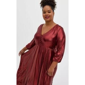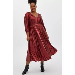 A show-stopping metallic red tea-length dress from Torrid, crafted in a liquid knit fabric for striking elegance. This dress features a flattering V-neckline, partial button placket, 3/4 sleeves with stretch cuffs, and a comfortable stretch waist. The pleated skirt moves beautifully, making it perfect for holiday events, weddings, or special nights out.