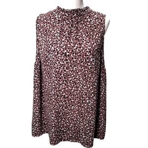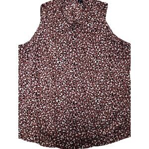 Short description: Torrid sleeveless mock-neck blouse in a dusty mauve base splashed with bold black-and-white leopard spots. Lightweight drapey 100 % polyester crepe flows away from the body for an easy, breezy fit, while the soft gathered ruffle neckline and keyhole back button add a touch of feminine glam. Perfect for dressing up the office look under a blazer, pairing with dark denim for date night, or leaning into that y2k party vibe. Plus size Torrid 2 (fits approx. 2X / 18-20).