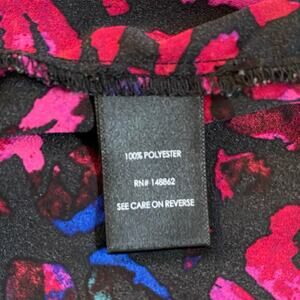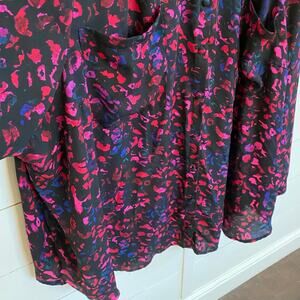 Torrid women's black, pink, red, and blue patterned Long sleeve collared full button front blouse. Features a collar, two front chest pockets and fabric buttons. Has long sleeves with buttons at wrist.