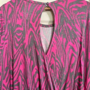 Stretch level: Maximum. 95% rayon, 5% spandex. Machine wash cold. Line dry. Relaxed crew neckline. Back neck closure. Short sleeves. Zebra print. Measurements Shoulder to shoulder: 18" Underarm to underarm: 26" Total Length: 37" Sleeve: 8.5" Waist: 42"-64" Inseam: 2.5" Offers always welcome! Measurements are approximations taken while hanging