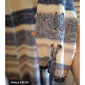 This cardigan provides a warm and stylish layering option. Its asymmetric hem and striped pattern add a modern touch, suitable for casual or office wear.