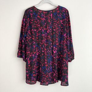 Torrid Womens Plus Leopard Print Georgette Tie-Front Peplum Blouse Plus Size 1. Torrid women's plus size blouse. V-neck. Tie front accent. 3/4 sleeves. Button accents at end of sleeves. Black with pink and blue pretty animal print design. 100% polyester. Lightweight. Size 1. Measured laying flat: measures 23" from armpit to armpit. Measures 23" from mid tag to end of sleeve. Measures 26.5" long from top of tag to hem of blouse.