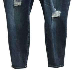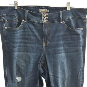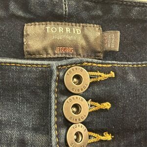 Keywords: Torrid, plus size, jeggings, high-rise, destructed denim, super soft, dark wash, women's jeans, casual wear, comfortable fit, stylish, blue jeans, triple button closure, pre-owned, excellent condition.