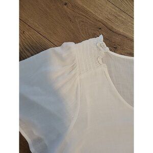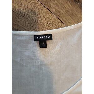 This Torrid blouse is a must-have for any woman's wardrobe. The ivory color and relaxed fit make it perfect for casual or workwear occasions. The blouse features a button front and smocked detailing, adding a touch of style.
