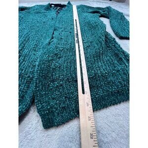 This chic Torrid cardigan, in a rich green chenille, features a unique lace-up back design. Ideal for layering, offering both comfort and style.