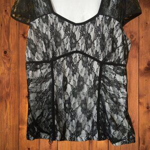 Torrid size 2 women's plus size blouse is a pullover with black lace overlay. The sleeves are sheer lace.