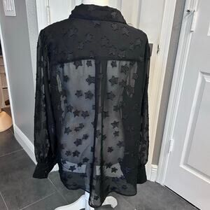 Torrid women’s Size 2 (2X) black sheer mesh blouse with embroidered star appliqués. Long sleeve button-down style with fabric-covered buttons and a loose, flowy fit. A standout celestial-inspired piece for layering, concerts, or night-out outfits.