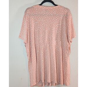 This Torrid women’s top features a soft peach base with white abstract dot print. Designed with short sleeves and a flattering surplice (wrap-style) neckline. Made from a comfortable, flowy stretch fabric that drapes beautifully — perfect for casual or dressy wear.