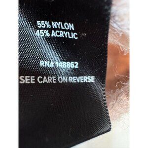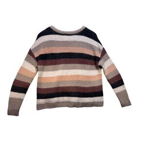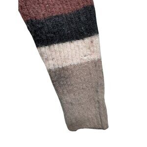 This Torrid sweater showcases a modern stripe pattern featuring muted tones. Made from a nylon and acrylic blend, it offers warmth and comfort. Ideal for a contemporary wardrobe, its subtle color palette complements a variety of outfits.