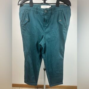 Teal capris with buttoned pockets. Comfortable and stylish. A lot of give for comfort.