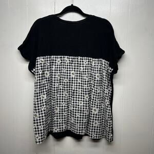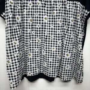 Torrid women's mixed media floral top. Round neck. Short sleeves. Plain black front with contrasting gingham print floral back. Lightweight. In good used condition. No stains, tears or holes.