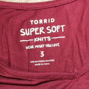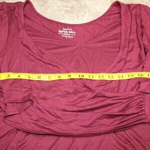 Elevate your wardrobe with this Torrid women's top in a rich burgundy shade, perfect for adding a touch of sophistication to your everyday look. Crafted from a super soft knit blend of 95% rayon and 5% spandex, this top offers exceptional comfort and a flattering stretch fit. The surplice neckline creates an elegant V-shape with a gathered detail that enhances the bust, while the puff sleeves add a subtle feminine flair.