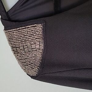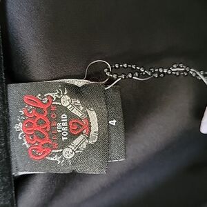Heavy fabric. Embellshed at the shoulders with silver embellishments. Surplice at the chest. Long sleeves. Fabric does stretch. There is a hole on the inside of the fabric at the neck, the hole does go through to the outside however it is very small on the outside and I don't feel noticeable. There is a round mark on the fabric in the back, see pic. Edgy, punk, goth, feminine, flirty, curvy, plus, event, minimalist, neutral, biker, concert, festival, dinner, date night, going out, witchy, glam