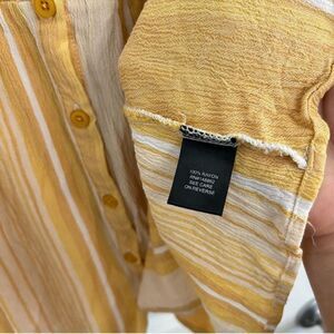 An allover yellow and white striped print brightens up this gauze tank that features a high neck and buttons at the front in a babydoll silhouette.