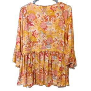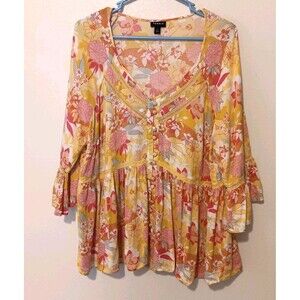 Torrid Babydoll/tunic top size 14/16. Yellow with Multi Colored floral print, pink, orange, and white. V-neckline with a partial button front. Lace/crochet trim detailing along the v-neck. 3/4 sleeves with tiered ruffled bell cuff, with lace accents. Babydoll silhouette with flowing, gathered hem. Lightweight (crinkle texture) 100% rayon. Armpit to Armpit 23in, length 27in, sleeves 18in.