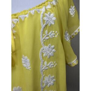 The Torrid Yellow Smocked Floral Chiffon Short Sleeve Blouse in Plus Size 1 is a stylish and lightweight blouse perfect for summer and spring occasions. With a vibrant yellow color and a flattering flutter sleeve design, this blouse offers a regular fit and is made from smooth chiffon fabric. It features a tie closure and a round neckline, making it suitable for travel, parties, or casual wear. Machine washable and with stretch for comfort, this blouse from Torrid is a versatile addition to any woman's wardrobe. It has elastic in the hem for a very flattering look.
