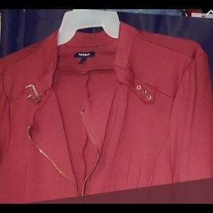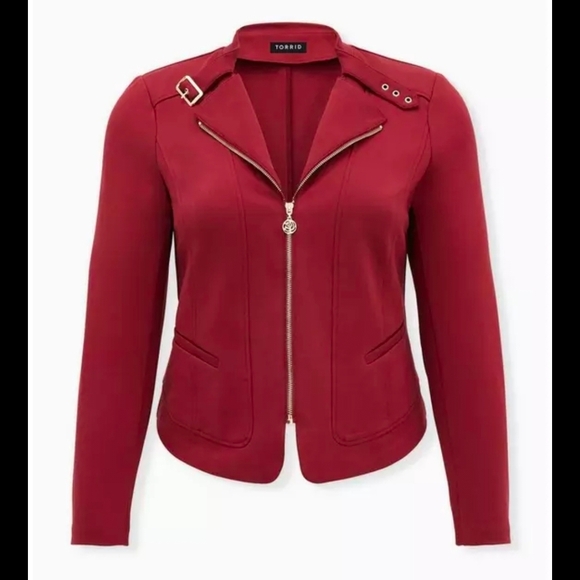 Torrid Studio Ponte Zip Front Jacket with Buckle Detail, Burgundy in color size 5 (28w). Good Used condition.