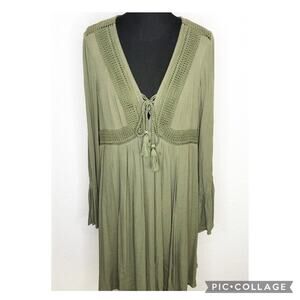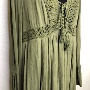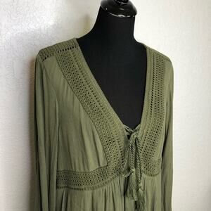 Torrid army olive green slit sleeve tassel peasant dress. Pullover style with v neckline. Tassel tie at front neckline. Eyelet crochet trim. Open slit sleeves with slit sleeve cuffs. Fully lined. Size 0 or Large. Excellent preowned condition. One tiny snag on sleeve.