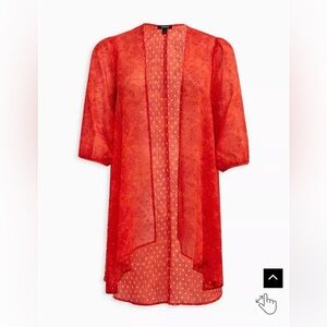 NWT and no defects. Size 5 TORRID blouson sleeve kimono in a clip dot chiffon red. Armpit to armpit measured on back 31” and centerback length is 41”. Retail $59.50. Tote 19.