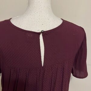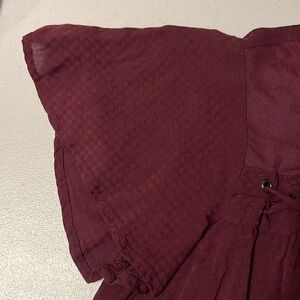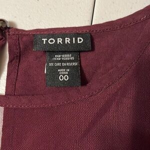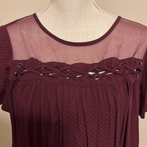 Torrid burgundy top. Sheer yoke with horizontal braiding. Gathered bodice, flared cap sleeves. Slit back opening with button closure. Size 0 (see chart) for size .New without tag