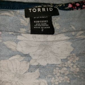 Torrid button down Teal with pink flowers top size 2 could fit a size 3 top is very soft and comfortable but lightweight beautiful covers your tummy and butt it's a great top! It's almost like new only worn it a couple of times the last picture of flowers is to show you the beautiful pink color no stains or holes and pet friendly smoke free