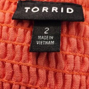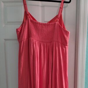 Torrid summer dress. Midi length. A-line empire waist dress makes for a flattering fit on curvy ladies. Pretty bright coral color is great for spring and summer. Very comfortable fit with some stretch. Fully lined. Wood colored buttons detail the front of the dress. I am 5' 4" and it comes 3/4 skirt length on me. Bought new from the Torrid store. Excellent condition.