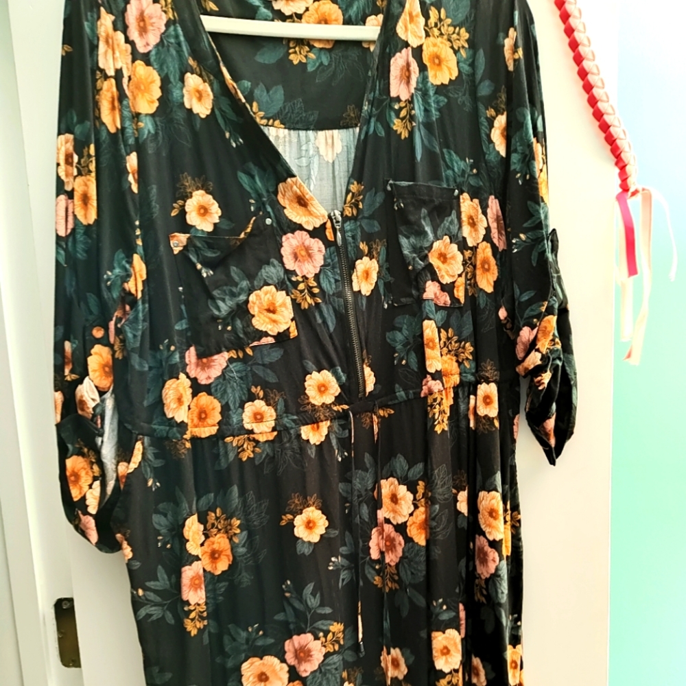 black with orange floral on top dress zipper Midway up the front and a tie in the front