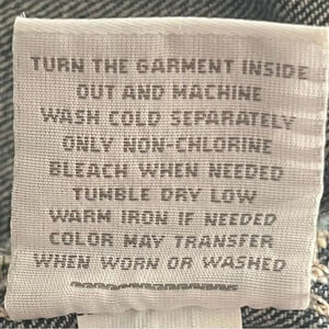•Washing Instructions: Turn garment inside out and machine wash cold, separately only, only non-chlorine bleach when needed, tumble dry low, warm iron if needed, color may transfer when worn or washed.