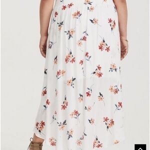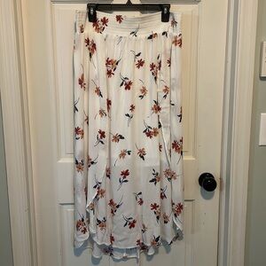 Printed watercolor flowers decorate a fluttering maxi skirt