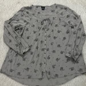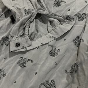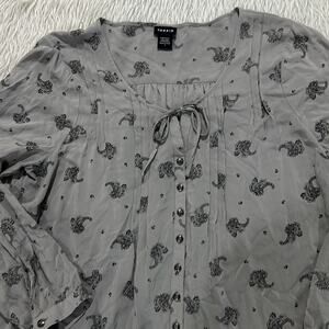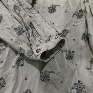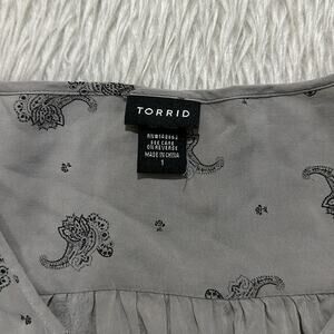 Torrid gray paisley long sleeve boho peasant top size 1, it’s pre owned and in good condition. The top is missing one button on the sleeve as you can see. It comes from a smoke free home.
