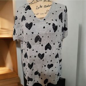 Torrid heart crochet knit sweater. This sweater is gray with black hearts and a V-neck cut.
