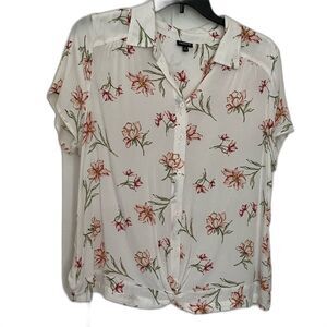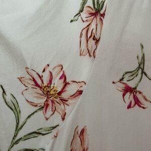 Off white with orange floral , twist front with elastic along back hem, button front , collar , size 2