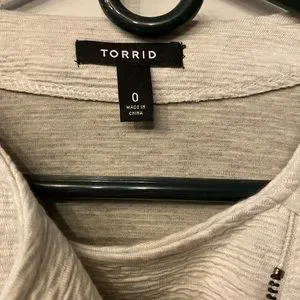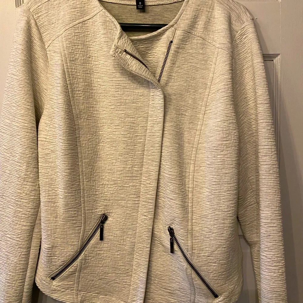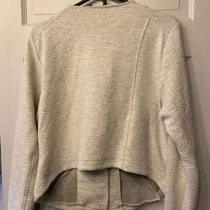 Jacket is gently used and in very good condition. Color is a light gray and material is stretchy and super comfortable. It is shorter in the back than the front and can easily be worn to work or dressed down with jeans or joggers.