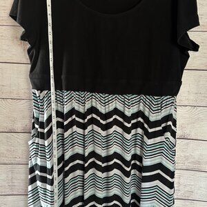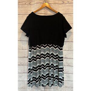 Torrid knit to woven chevron print dress. The top is a stretchy black knit, like your fave comfy t-shirt. The bottom is a woven chevron pattern in Black, white, and aqua blue color. Women's plus size 3X. This dress is in pre-owned condition. Please see photos. There is one small flaw on the front, in the chevron print part (it’s not a full hole, but the fabric got scratched). Purchased new in 2017. Price reflects condition. Like Torrid? Check out my other listings.