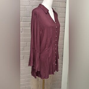 Chic plum blouse with button-down front. Features stylish bell sleeves, lace up back