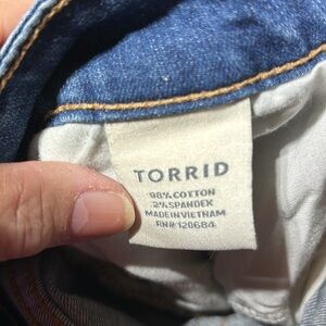 Torrid medium wash blue Jean denim shorts. One button and zipper closure. Five pockets. Size 26. Waist measures approximately 24. Inseam measures approximately five. Rise measures approximately 12. EUC.
