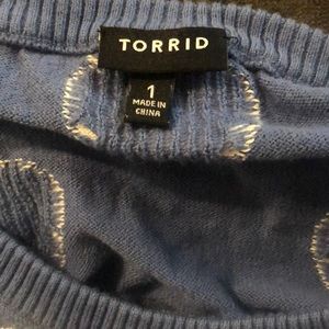 Adorable white heart pattern on a very comfy blue sweater 💙 it’s a size one from torrid! (1 wasn’t a size option!)