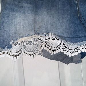 Chic blue jean shorts with delicate white lace trim. Ideal for casual wear. Super fun lace detail design.