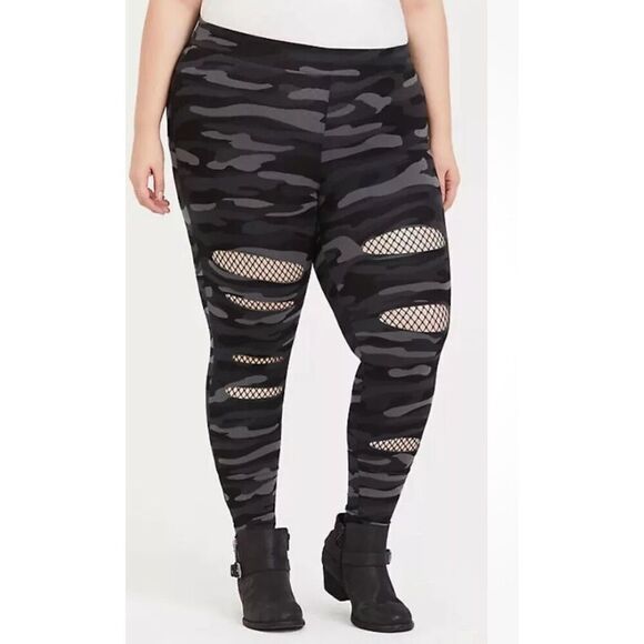 Our highly rated and expertly designed legging has a stretch waistband that holds you in with a tummy-smoothing effect. This legging adds some edge with slashed camo printed legs and fishnet inserts underneath.