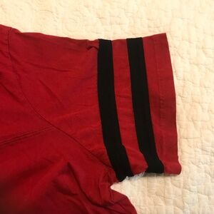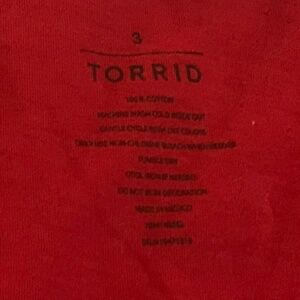 Torrid red short sleeve v-neck t-shirt decorated with heart made up of music notes on the chest and stripes on the sleeves. Size 3X / 22/24 (Torrid size 3). Measurements, materials and care instructions in pictures. Pre-loved (by me!)—I think I may have worn it once or twice before I shrunk out of it. I used it as a sleep shirt, but you do you. The heart and v-neck makes it a little romantic (Valentine’s Day!), the sleeve stripes make it a little sporty. Just a fun casual top, especially with jeans or shorts.