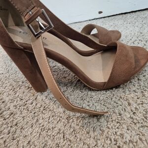Open toe, block heel, ankle strap brown suede sandle