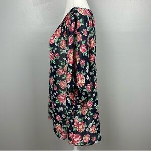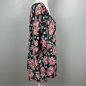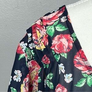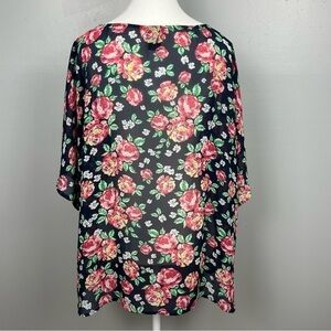 Torrid sheer button front black with floral print blouse, size 3X. Good condition, a couple of very minor pulls shown in photos. Approximate measurements 29” pit to pit, 28” shoulder to hem slightly longer in back.