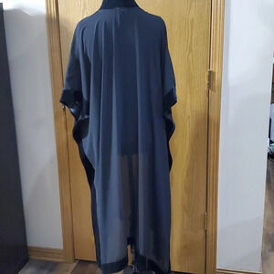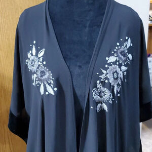 beautiful sheer long coverup by torrid kimono with high slit sides and velvet trim embroidered floral size 00/0 1x in real sizing black and grey excellent condition no issues