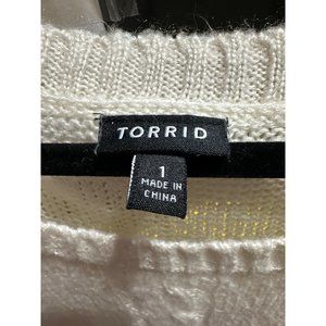 A subtly sophisticated Torrid cream cable knit sweater in size 1X. Its lightweight, soft fabric ensures comfort while the crew neck design adds a classic touch. Comes from a smoke free home.