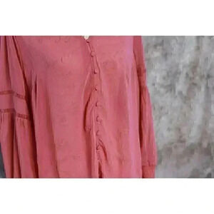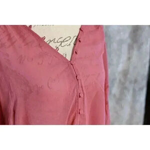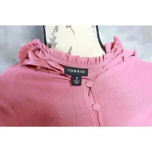 Elevate your wardrobe with this beautiful Torrid button-down blouse. The pink color and embroidered details make it perfect for a variety of occasions, from casual outings to parties and even workwear. The blouse features a V-neckline and puff sleeves for a stylish touch, while the elastic cuffs and relaxed fit ensure comfort.
