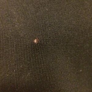 This sweater is turtle neck with a key hole opening. It was worn maybe 3 times but has a small (pen size) hole